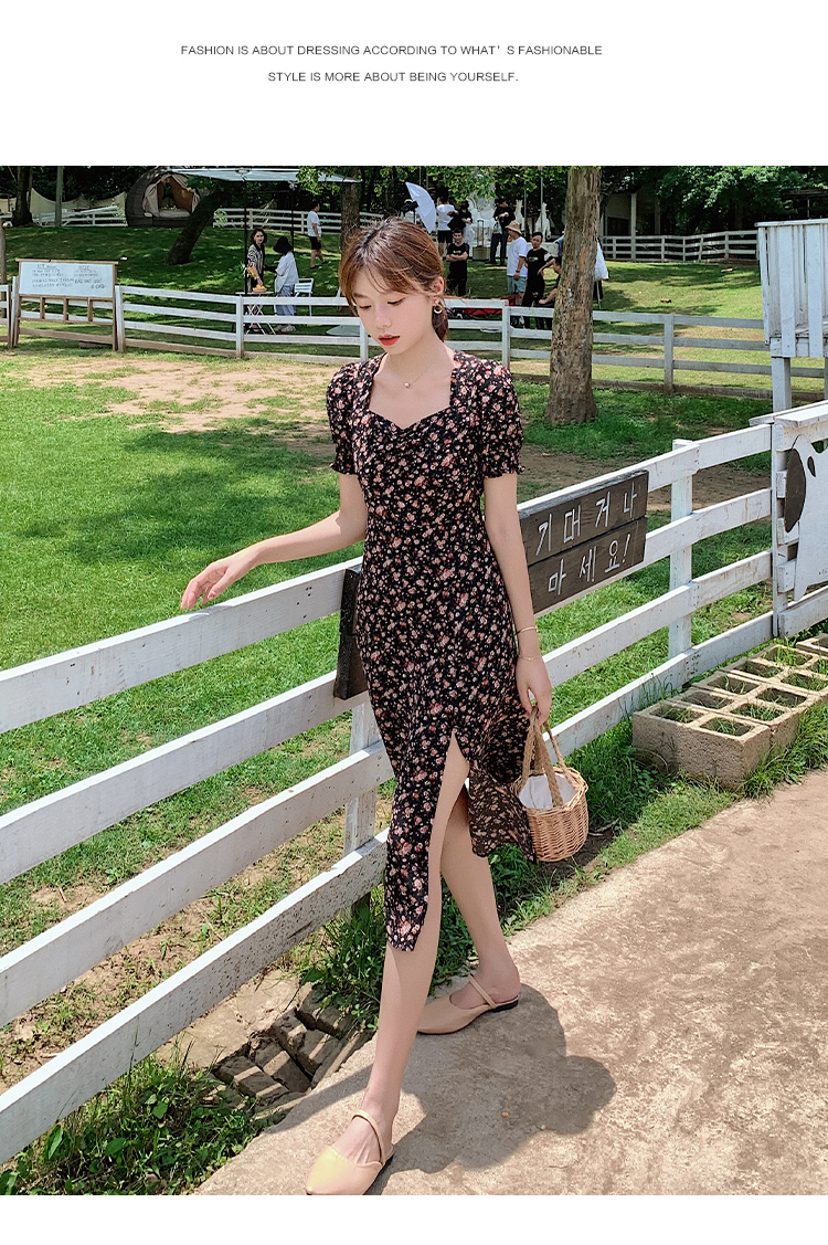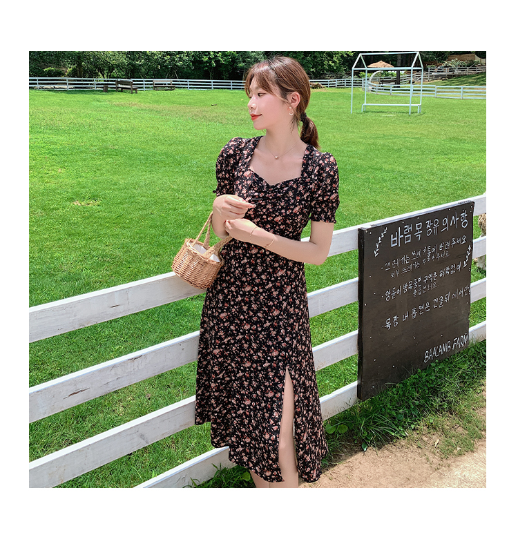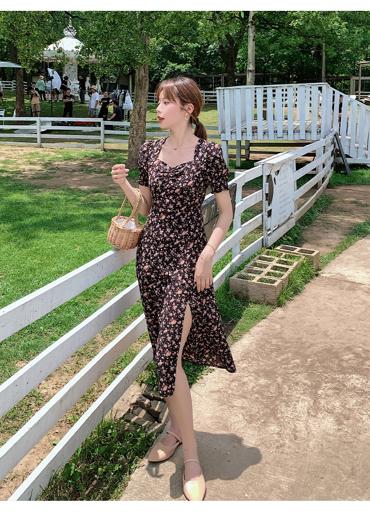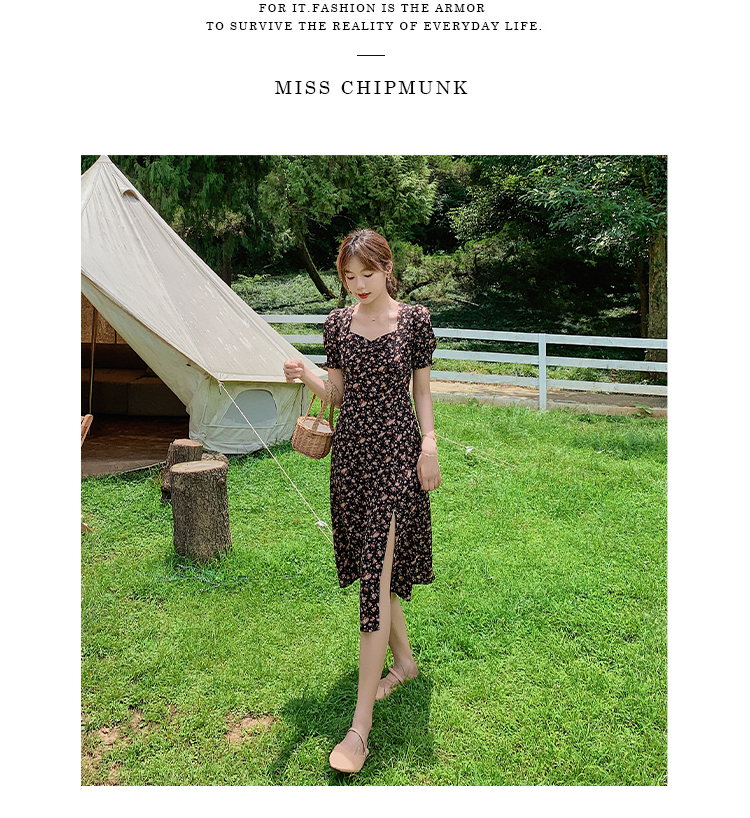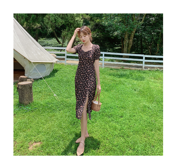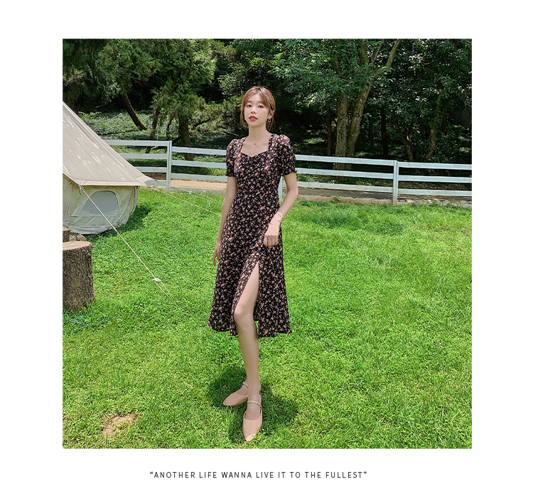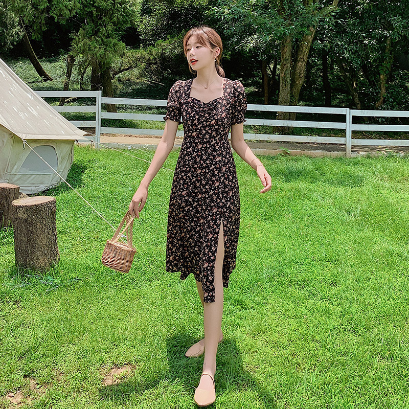 2021 new tea break floral dress female summer small design sense niche French slit temperament skirt