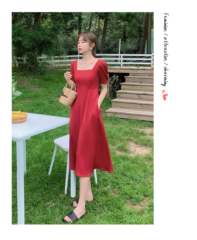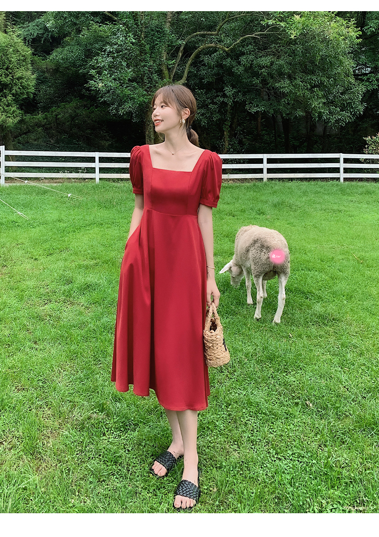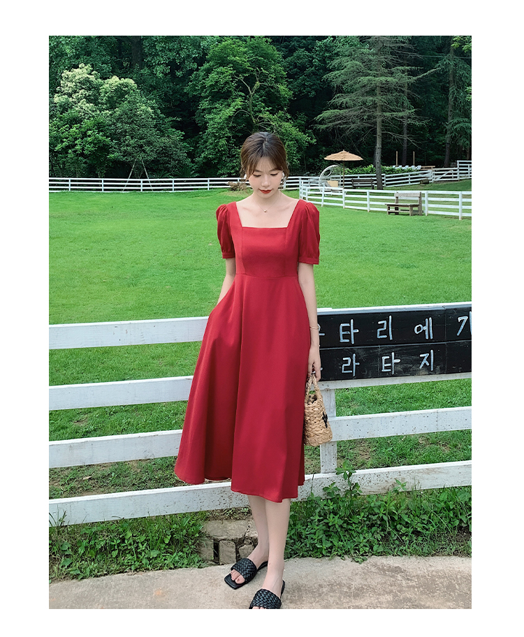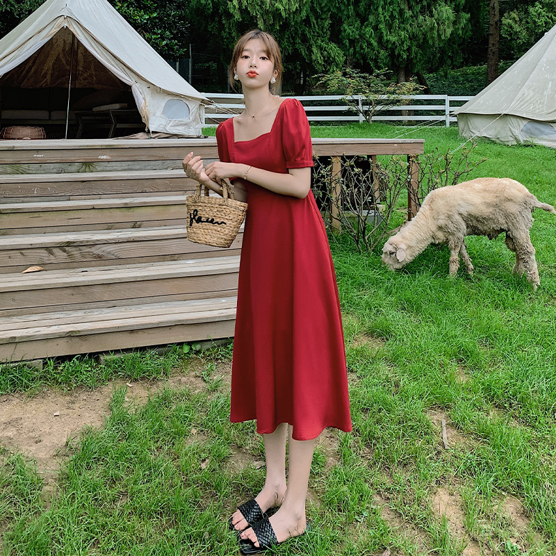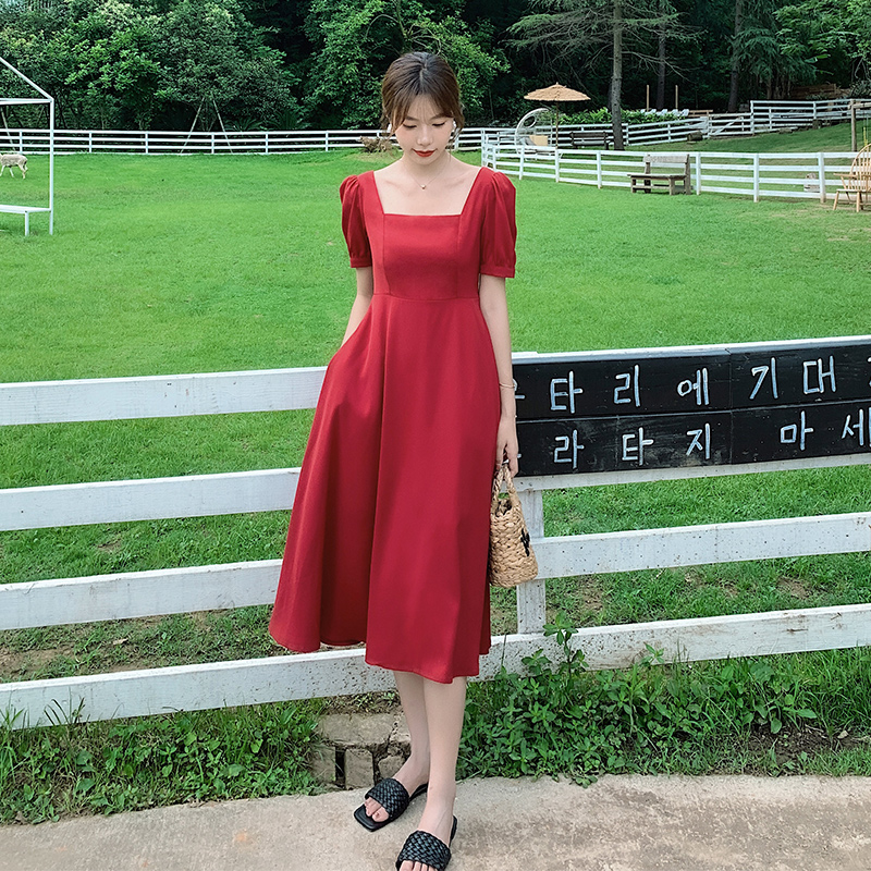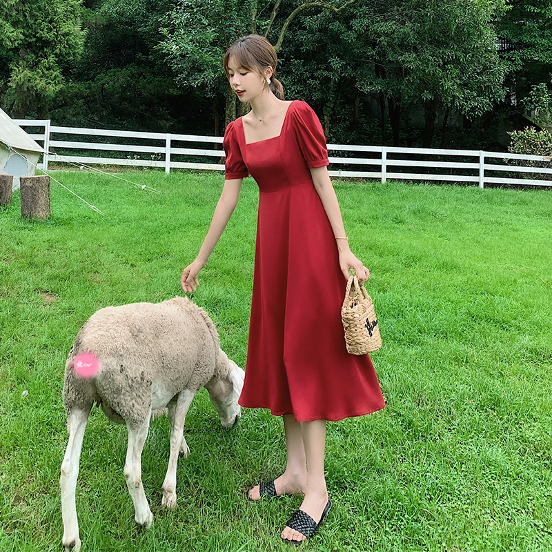 2021 new women's Korean style square collar red chiffon dress mid-length temperament puff sleeve French skirt