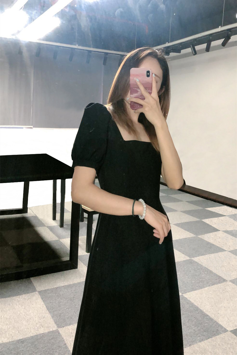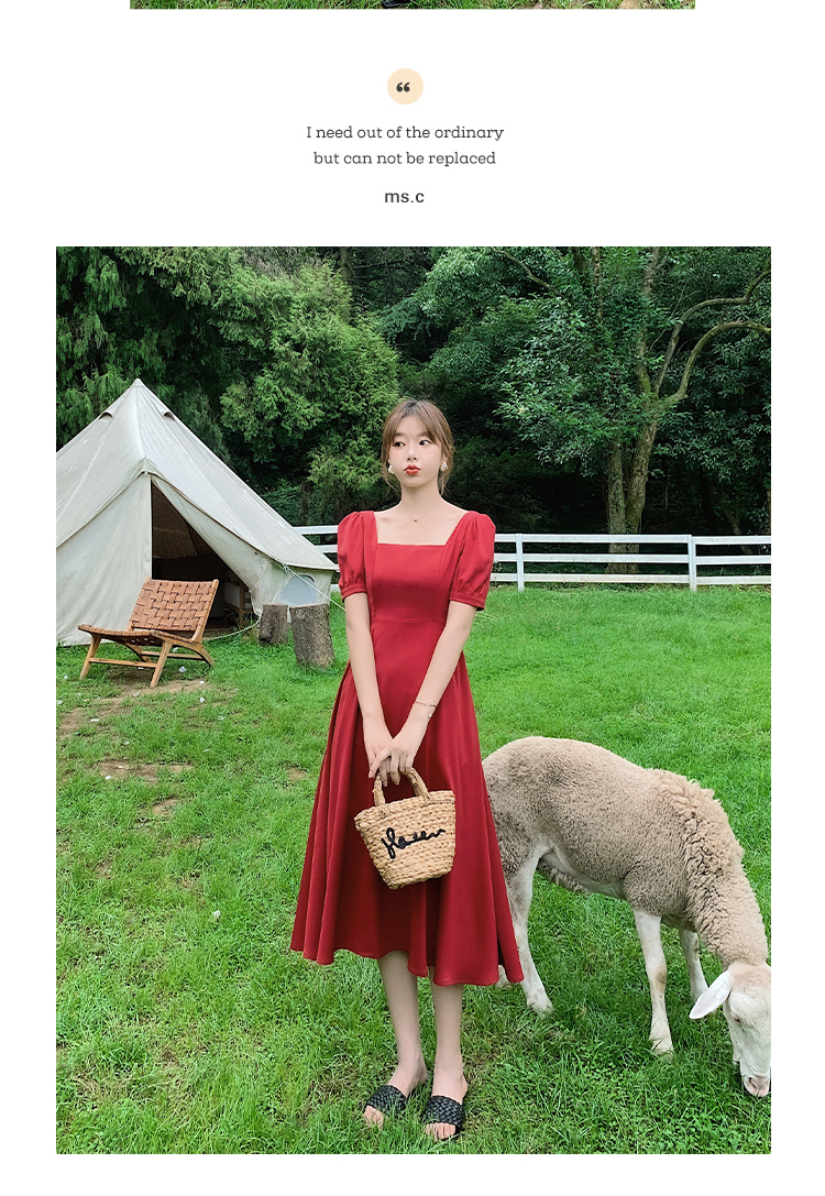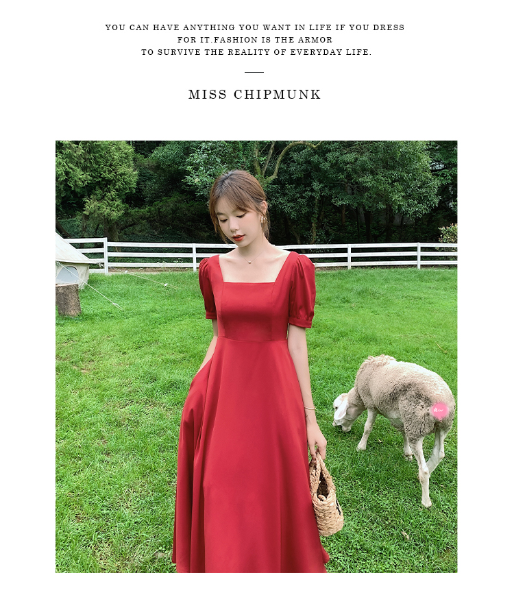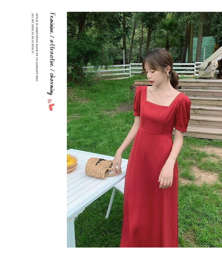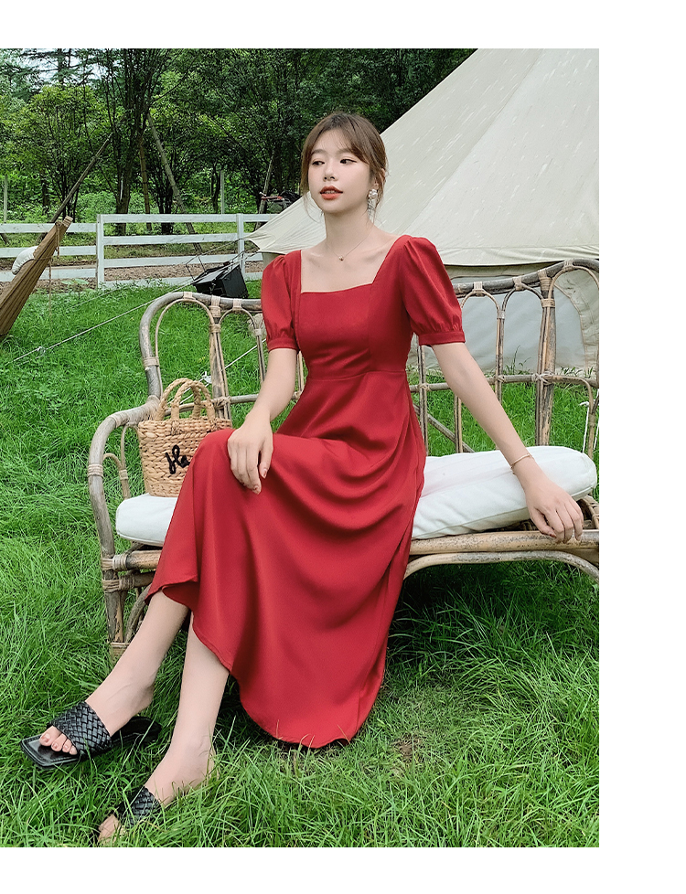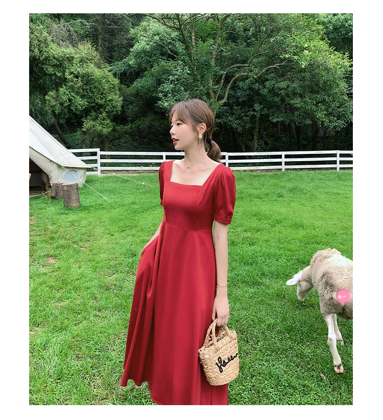 2021 new women's Korean style square collar red chiffon dress mid-length temperament puff sleeve French skirt