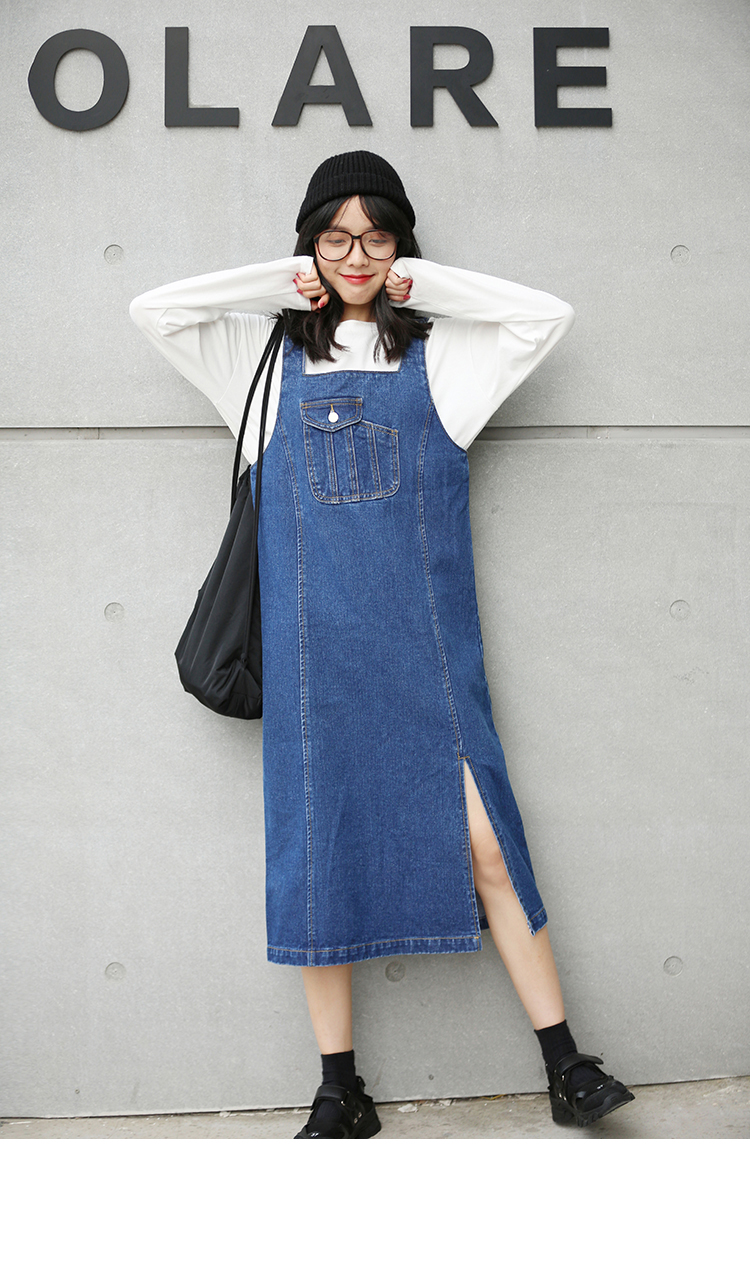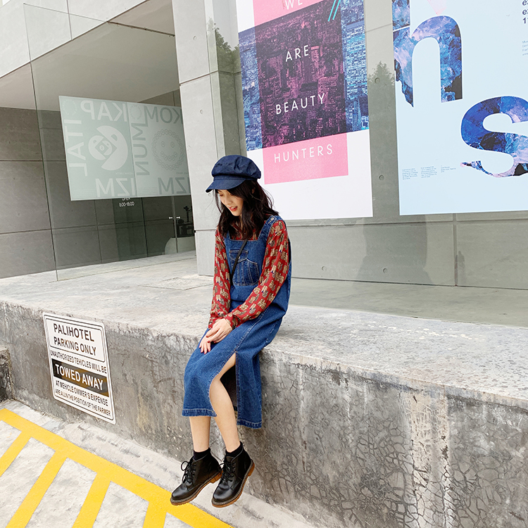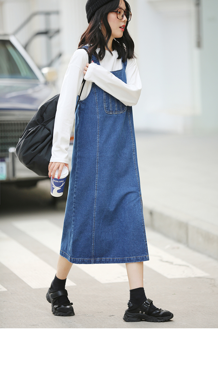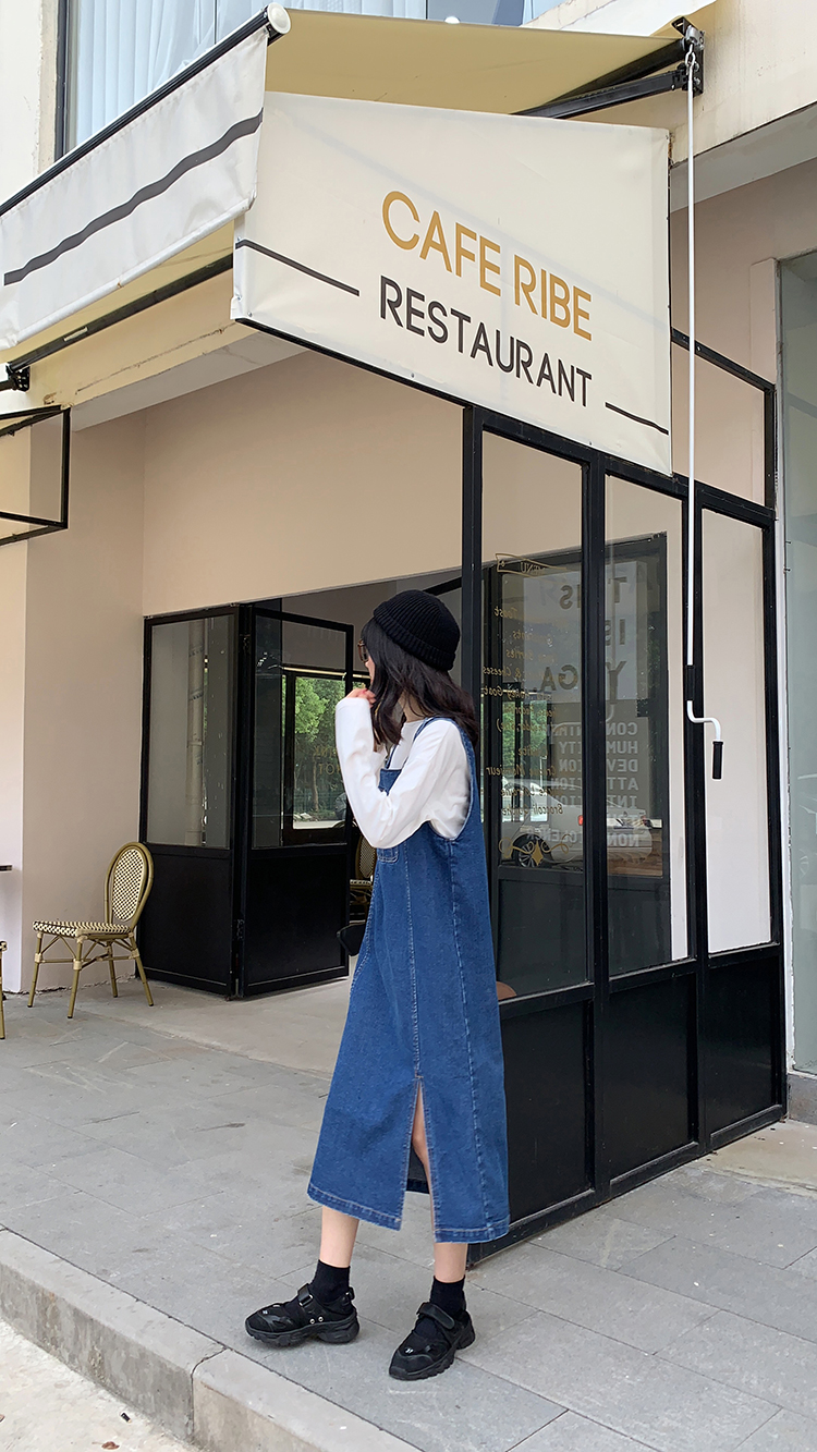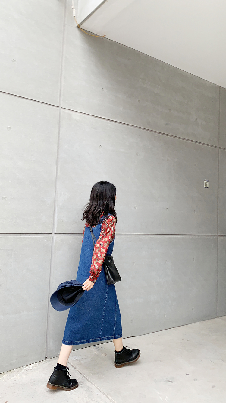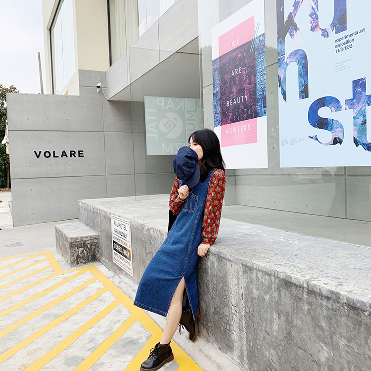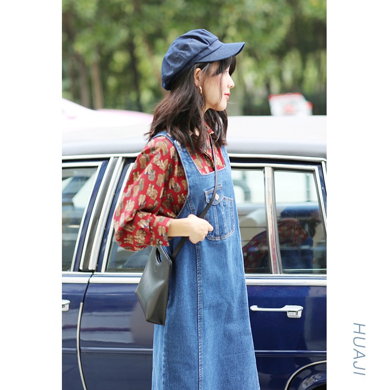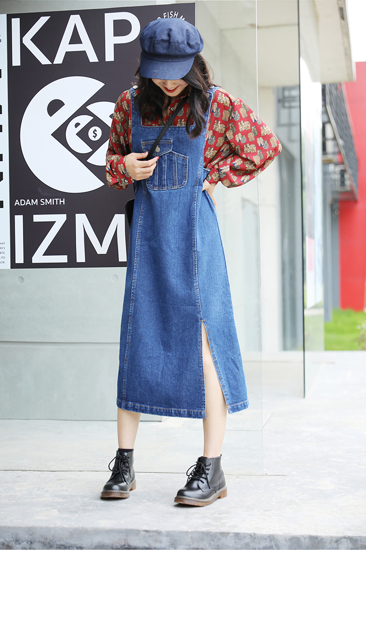 Huaji split denim suspender skirt female spring dress mid-length college style retro dress spring and summer Q020
