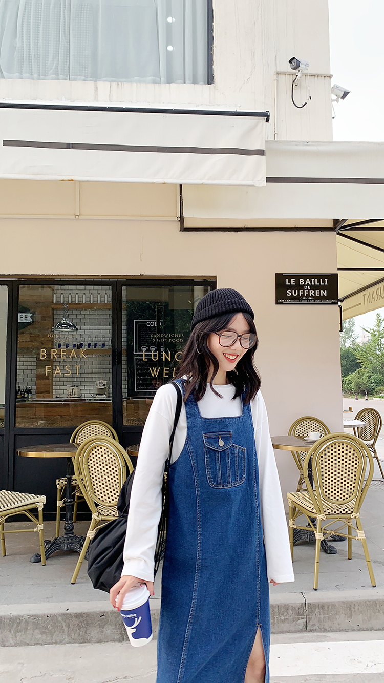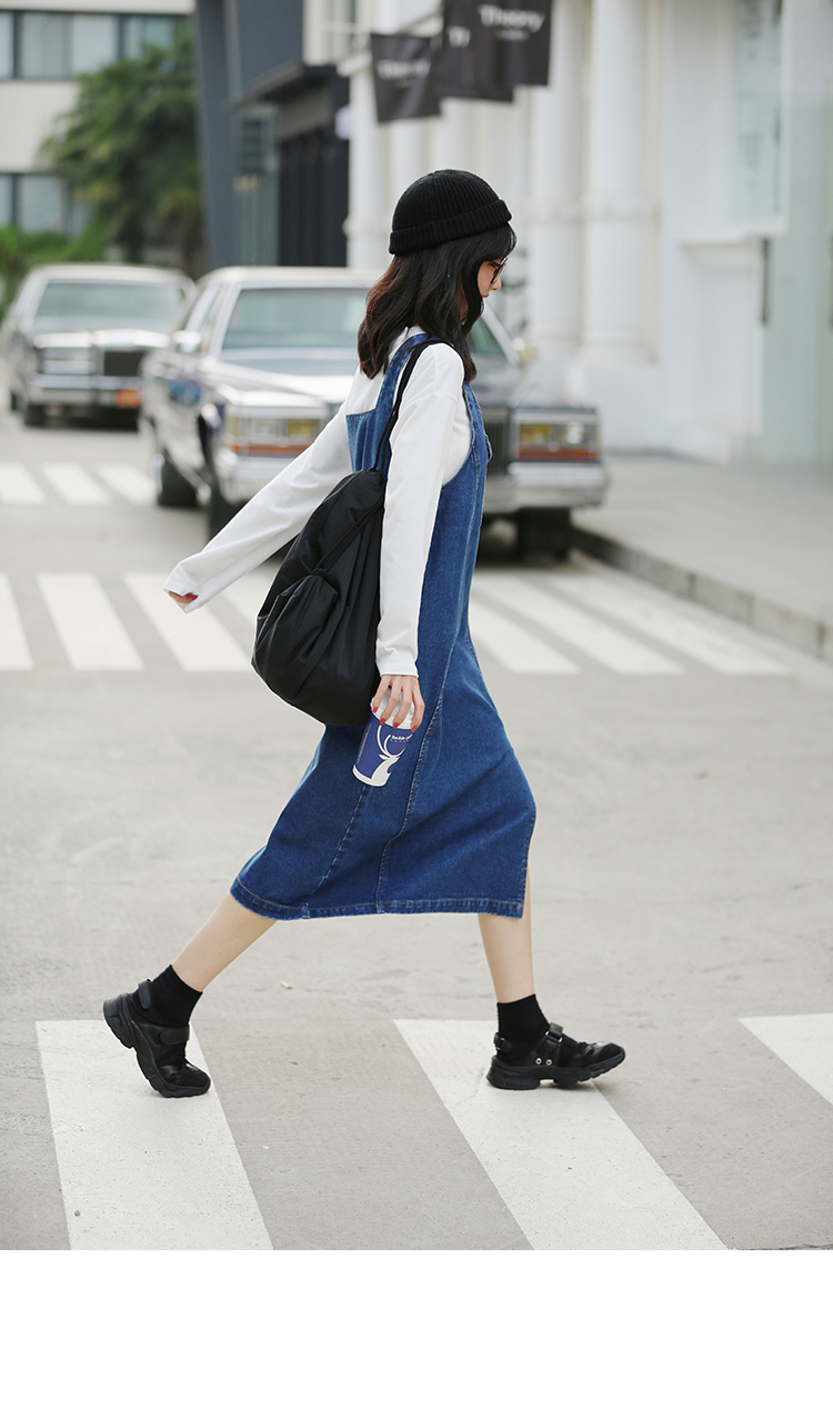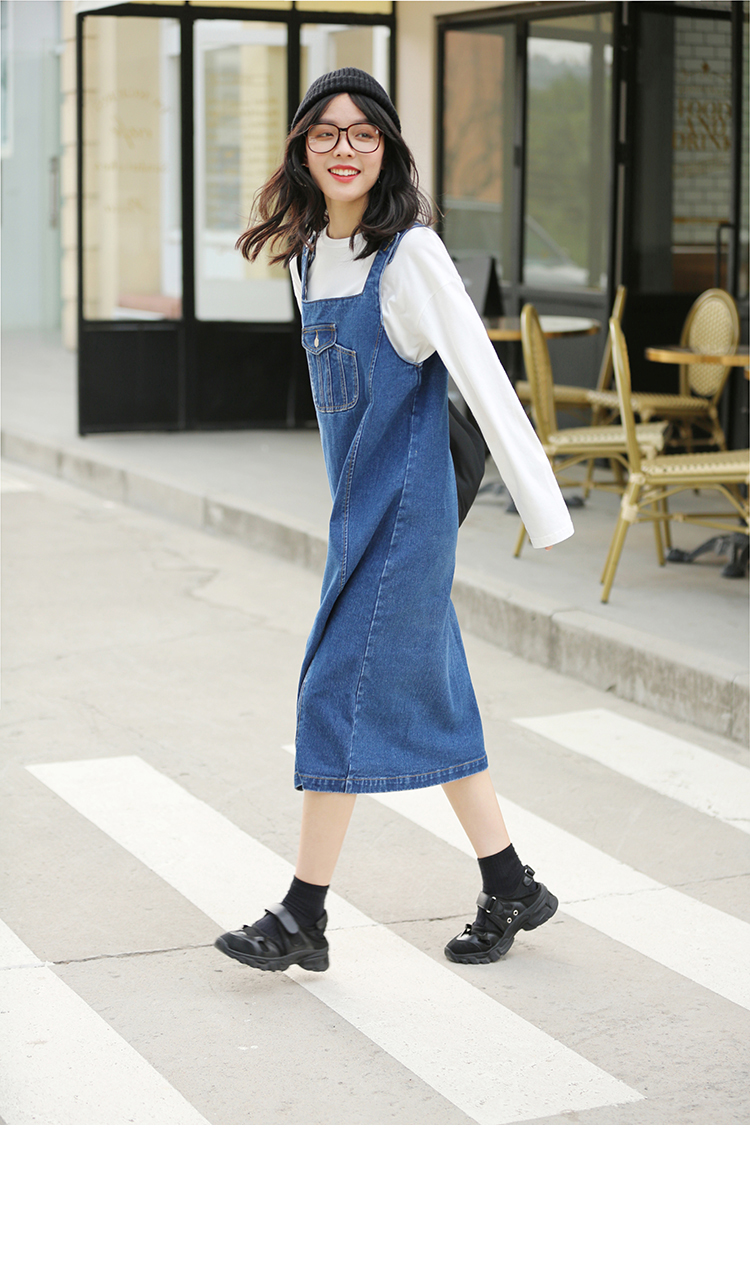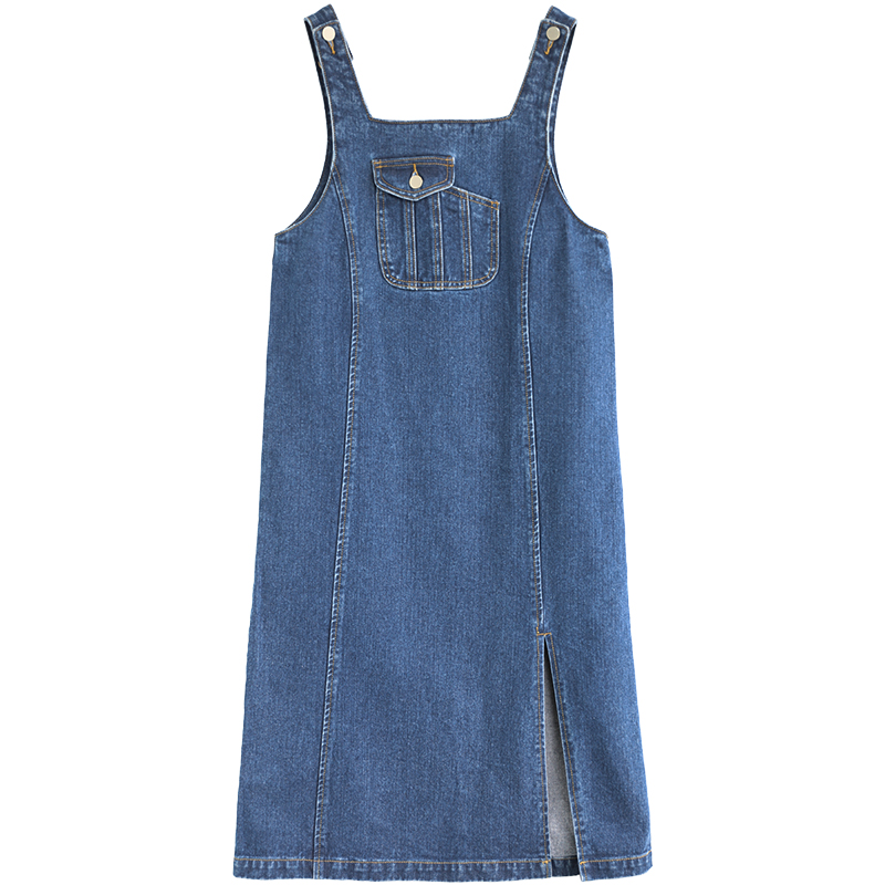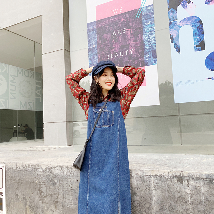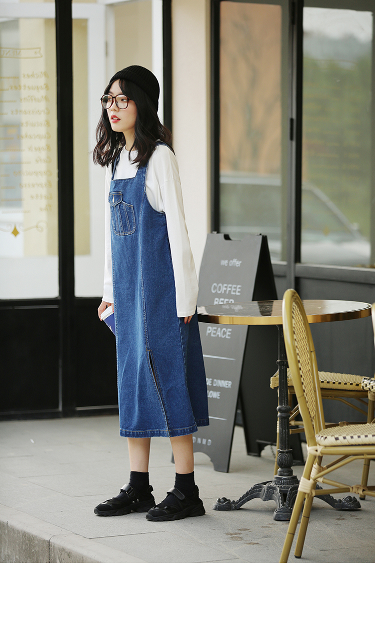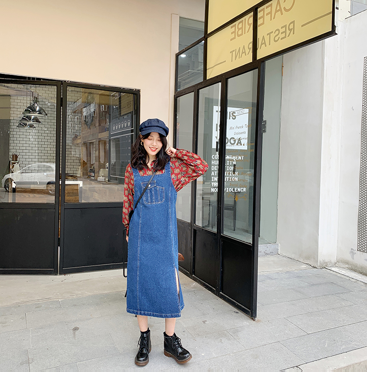 Huaji split denim suspender skirt female spring dress mid-length college style retro dress spring and summer Q020
