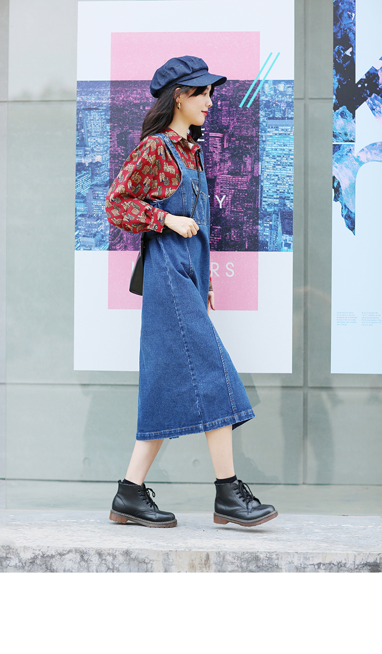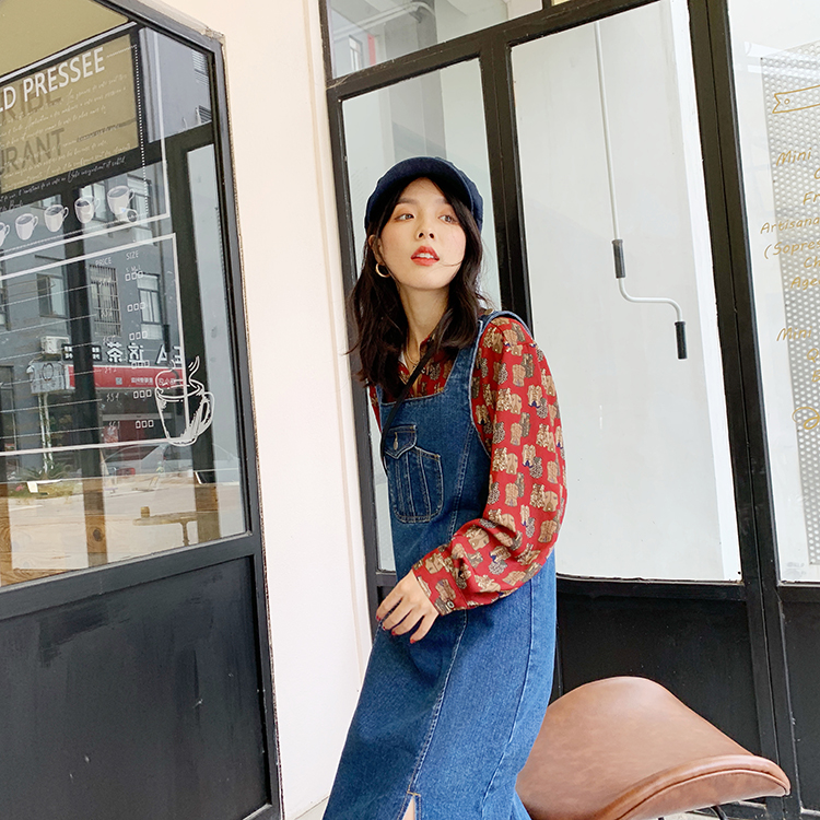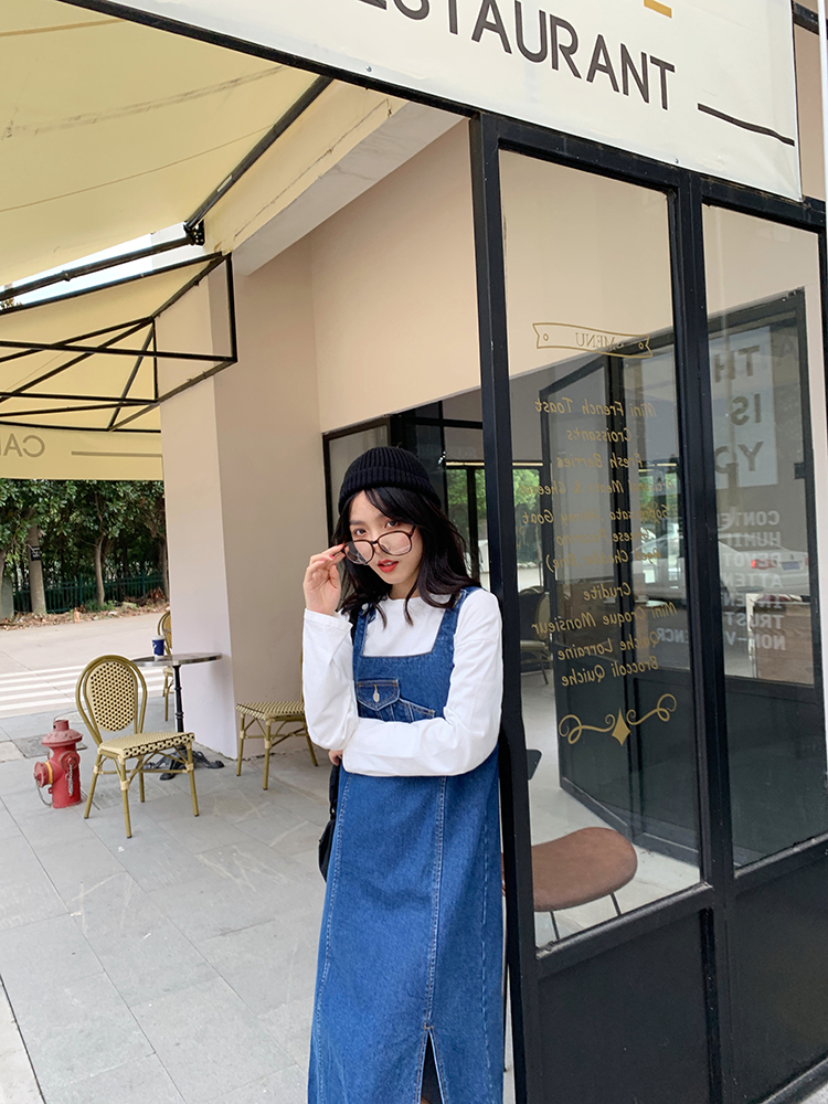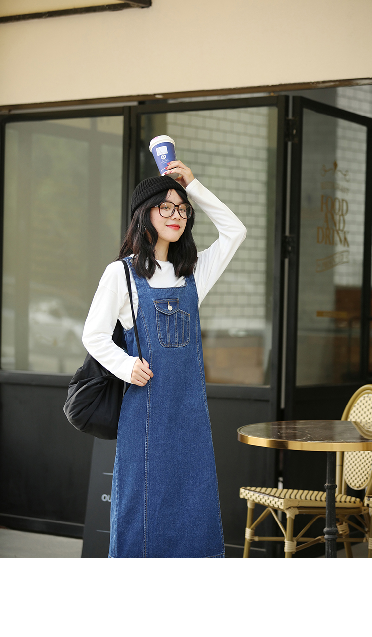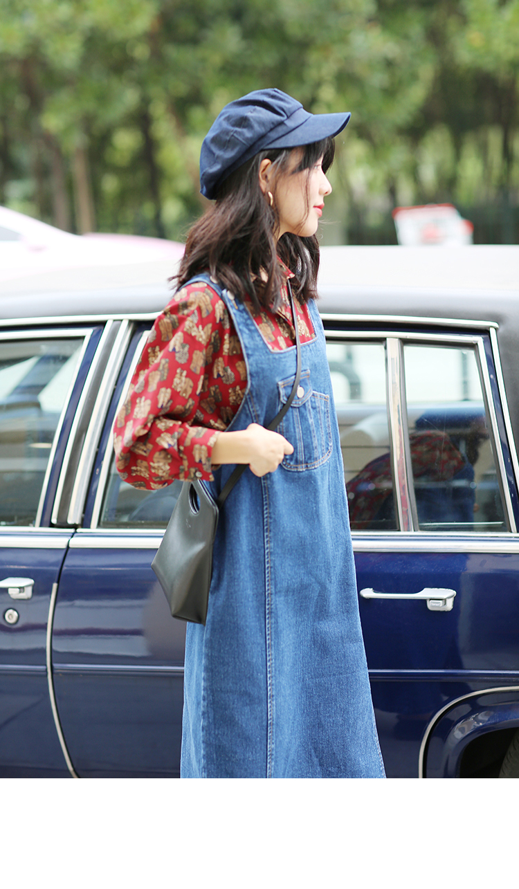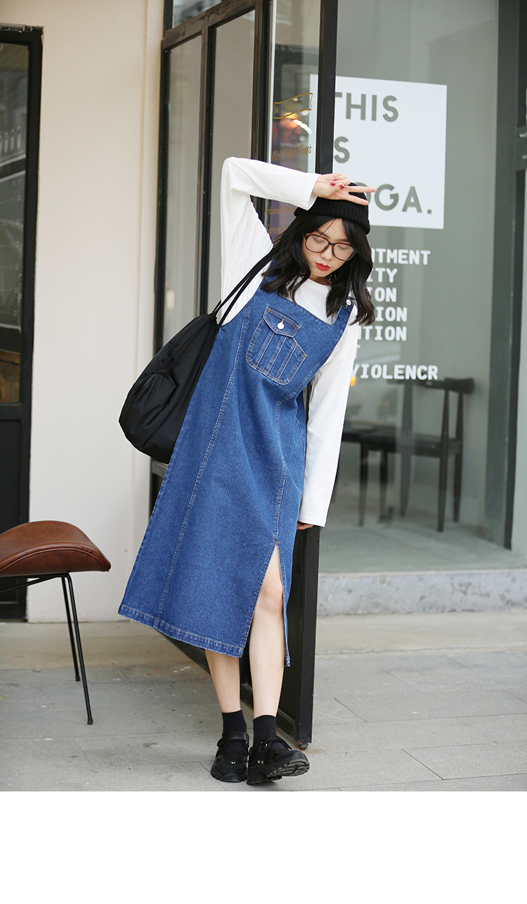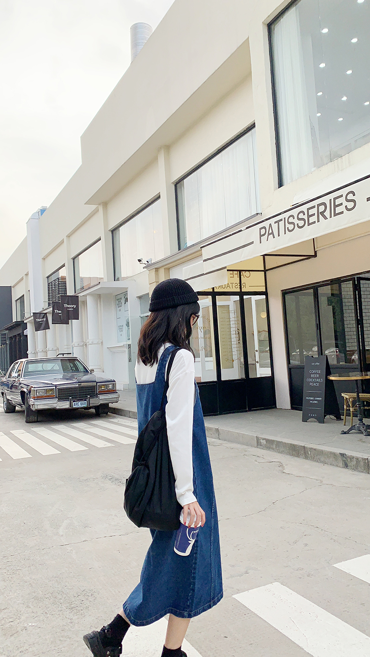 Huaji split denim suspender skirt female spring dress mid-length college style retro dress spring and summer Q020