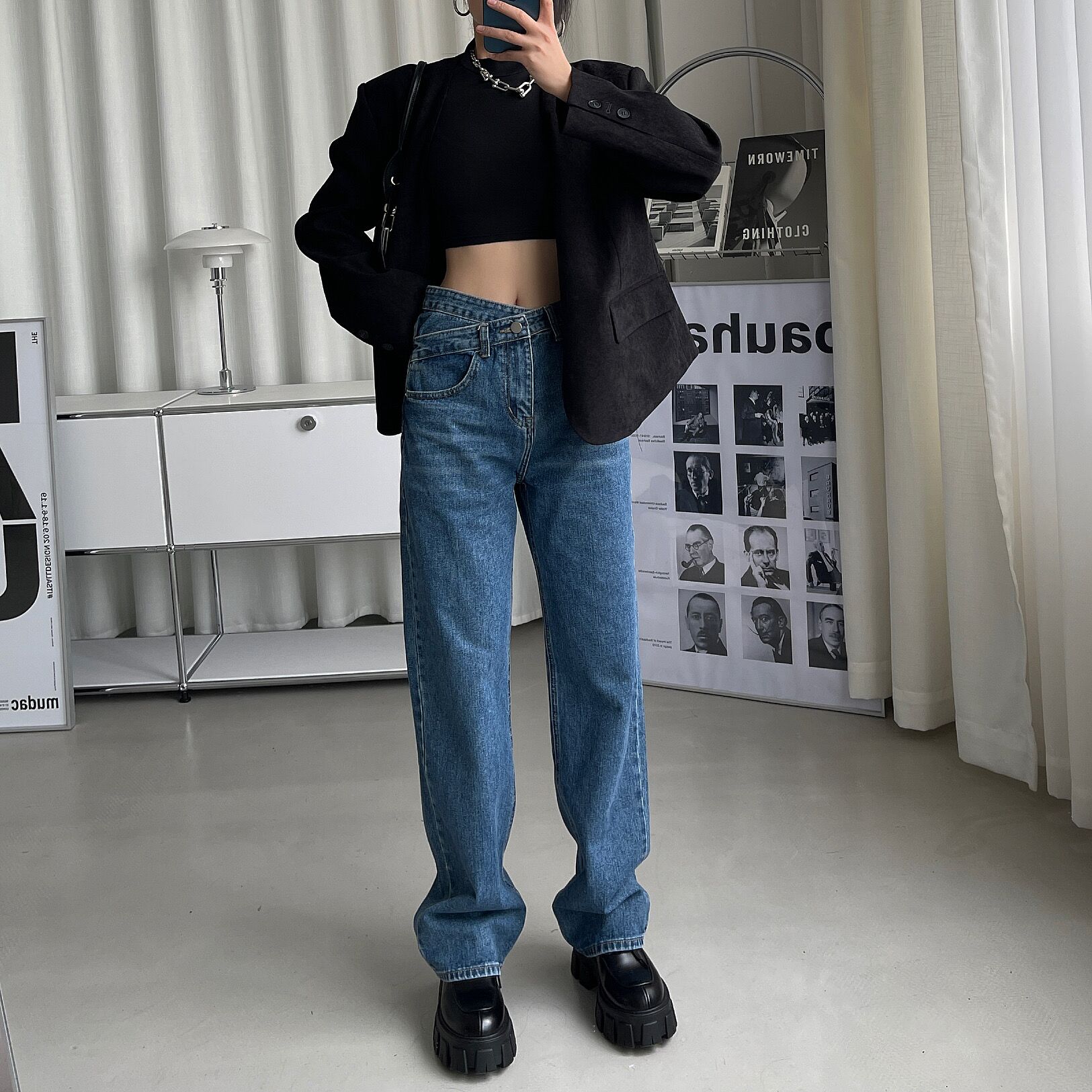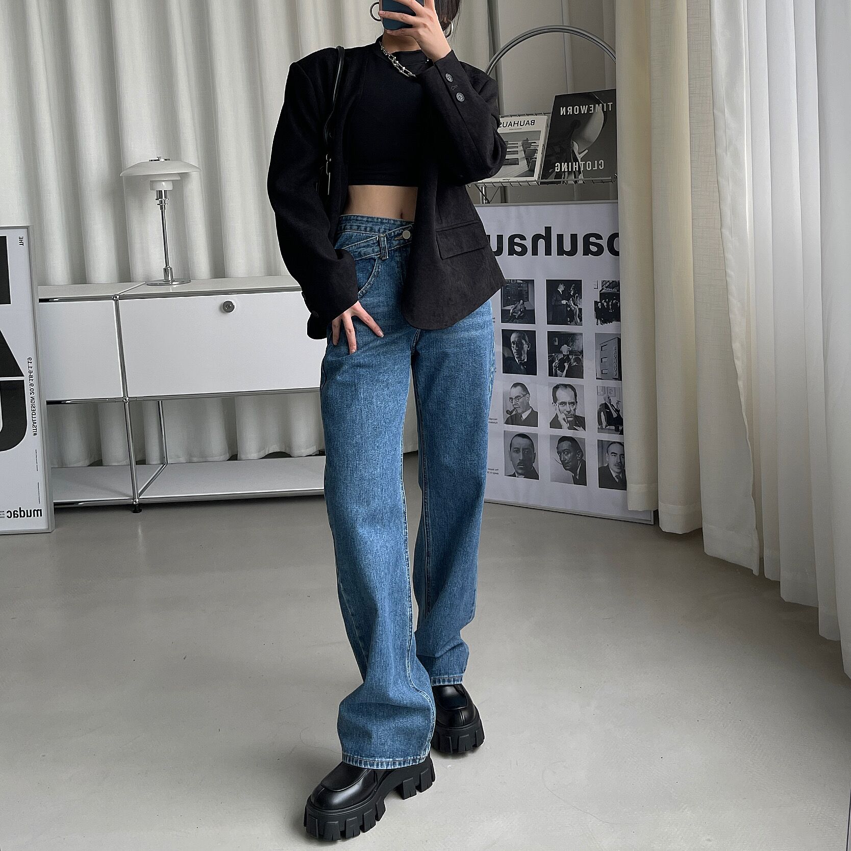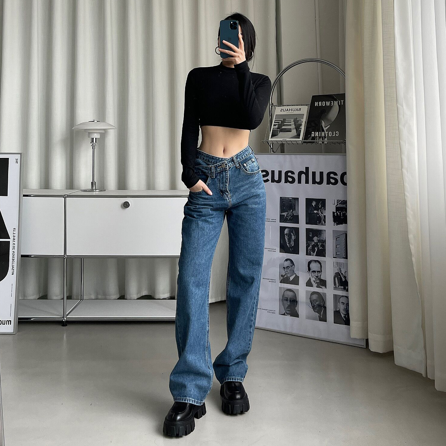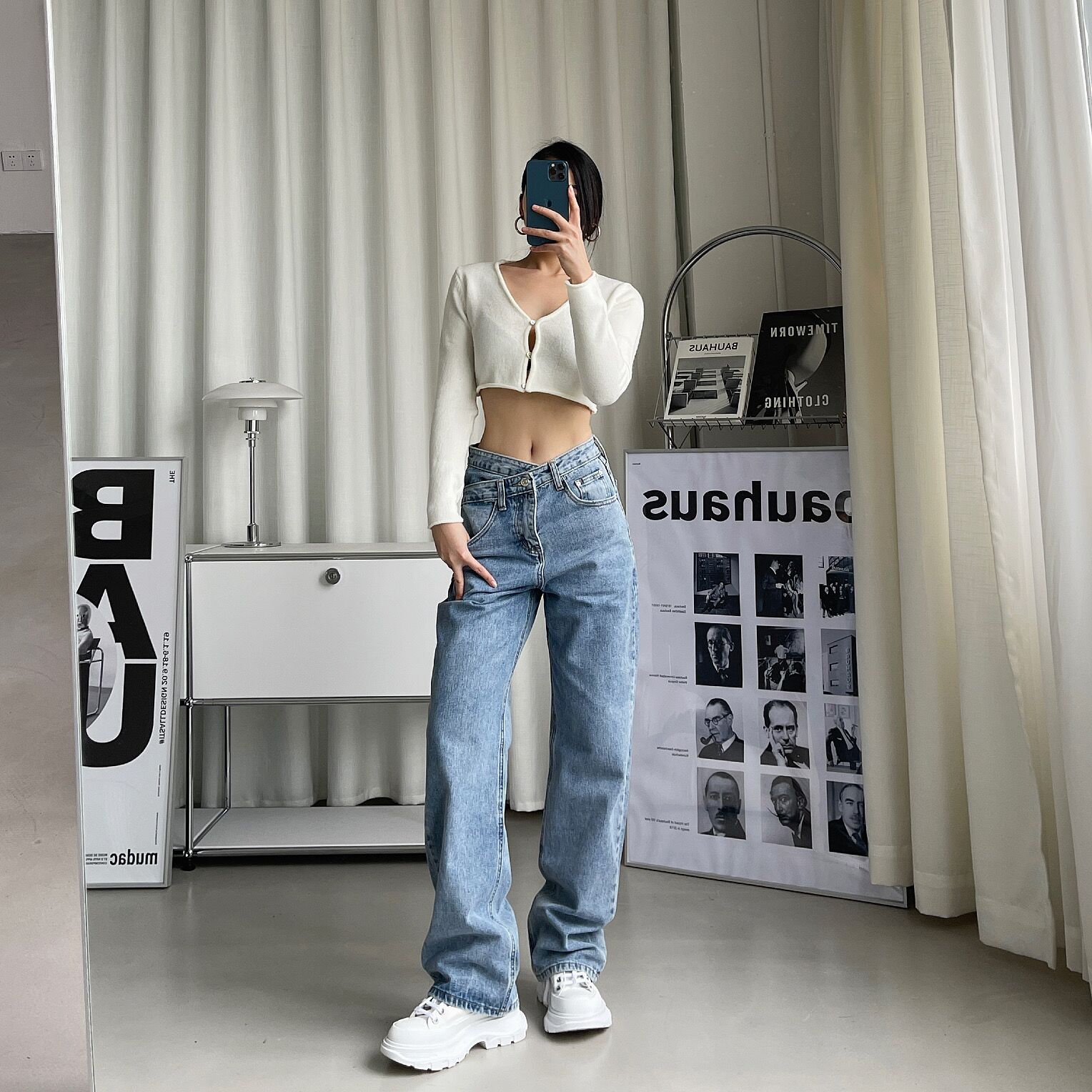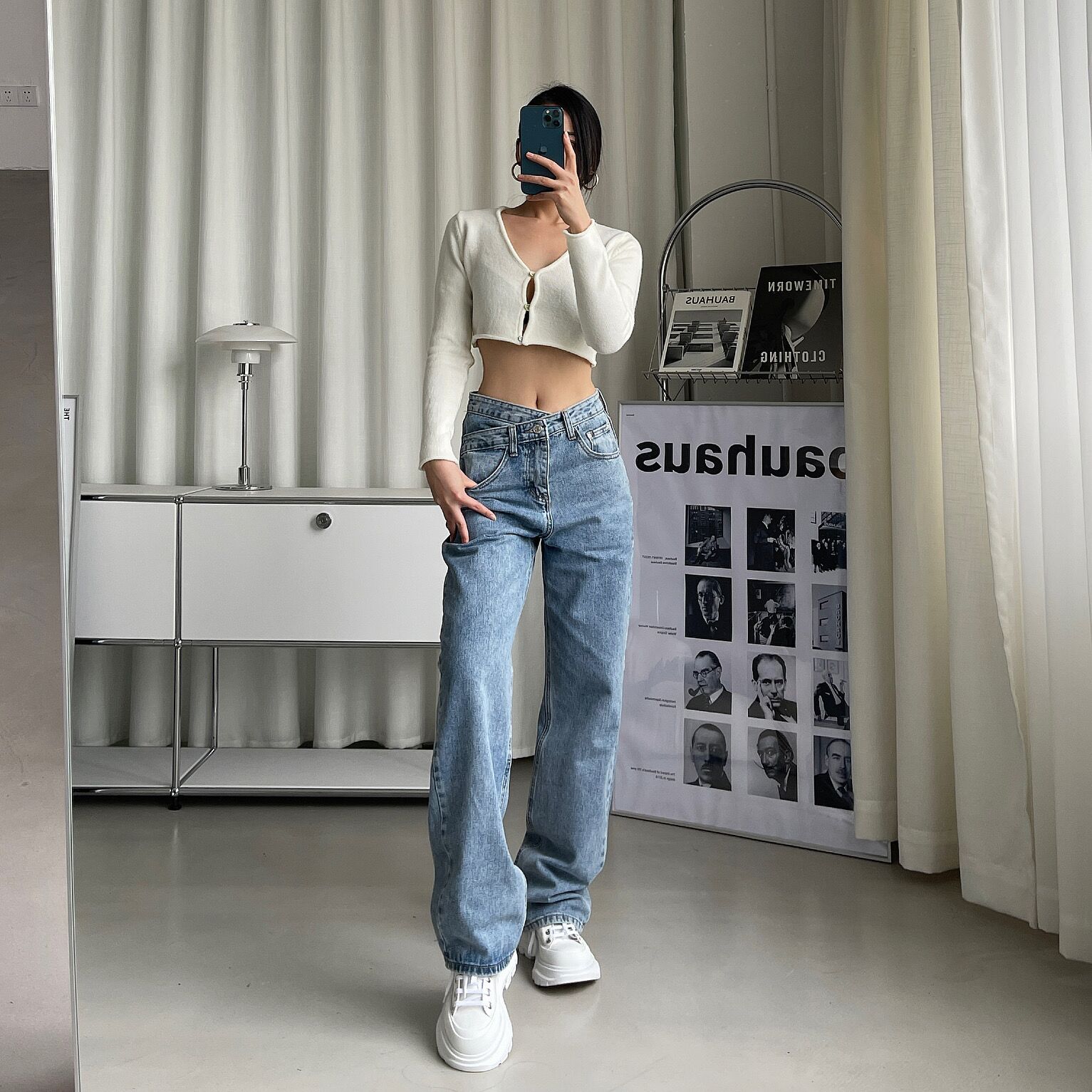 Spring new high waist straight waist loose waist design feeling street jean women pants
