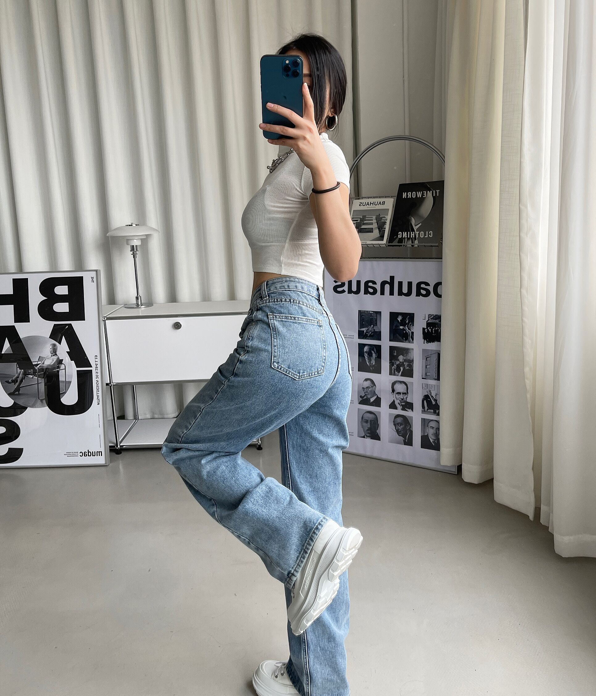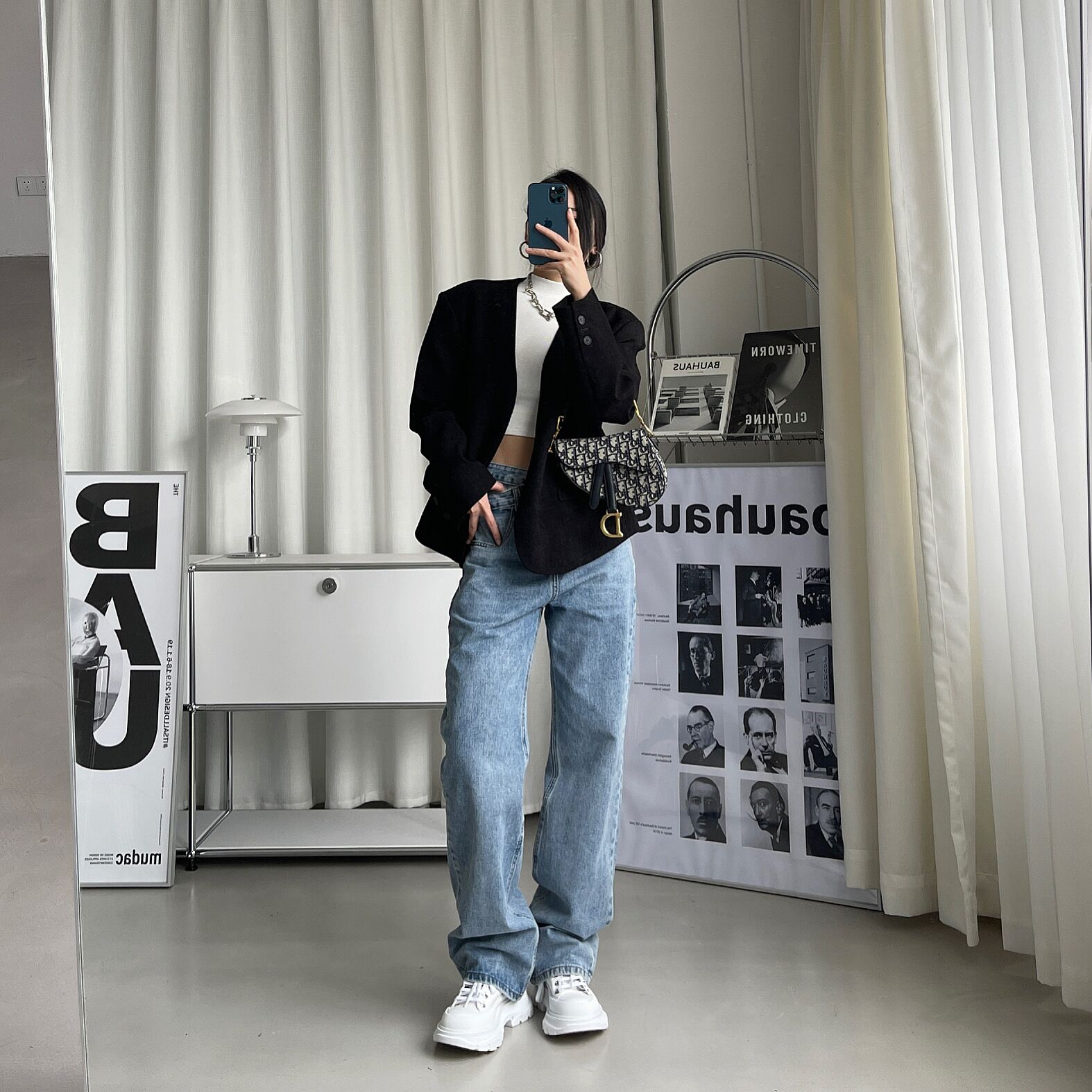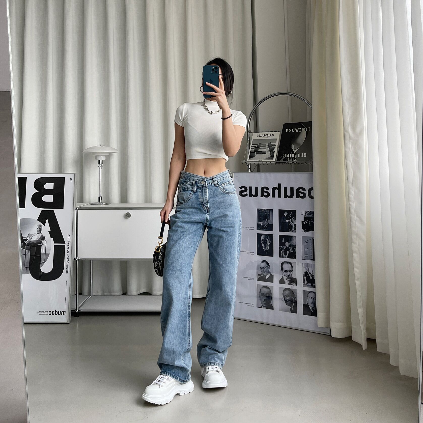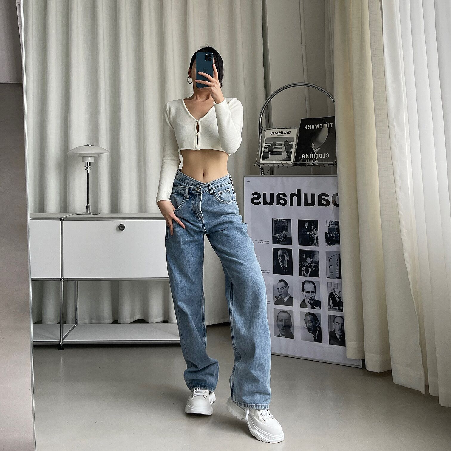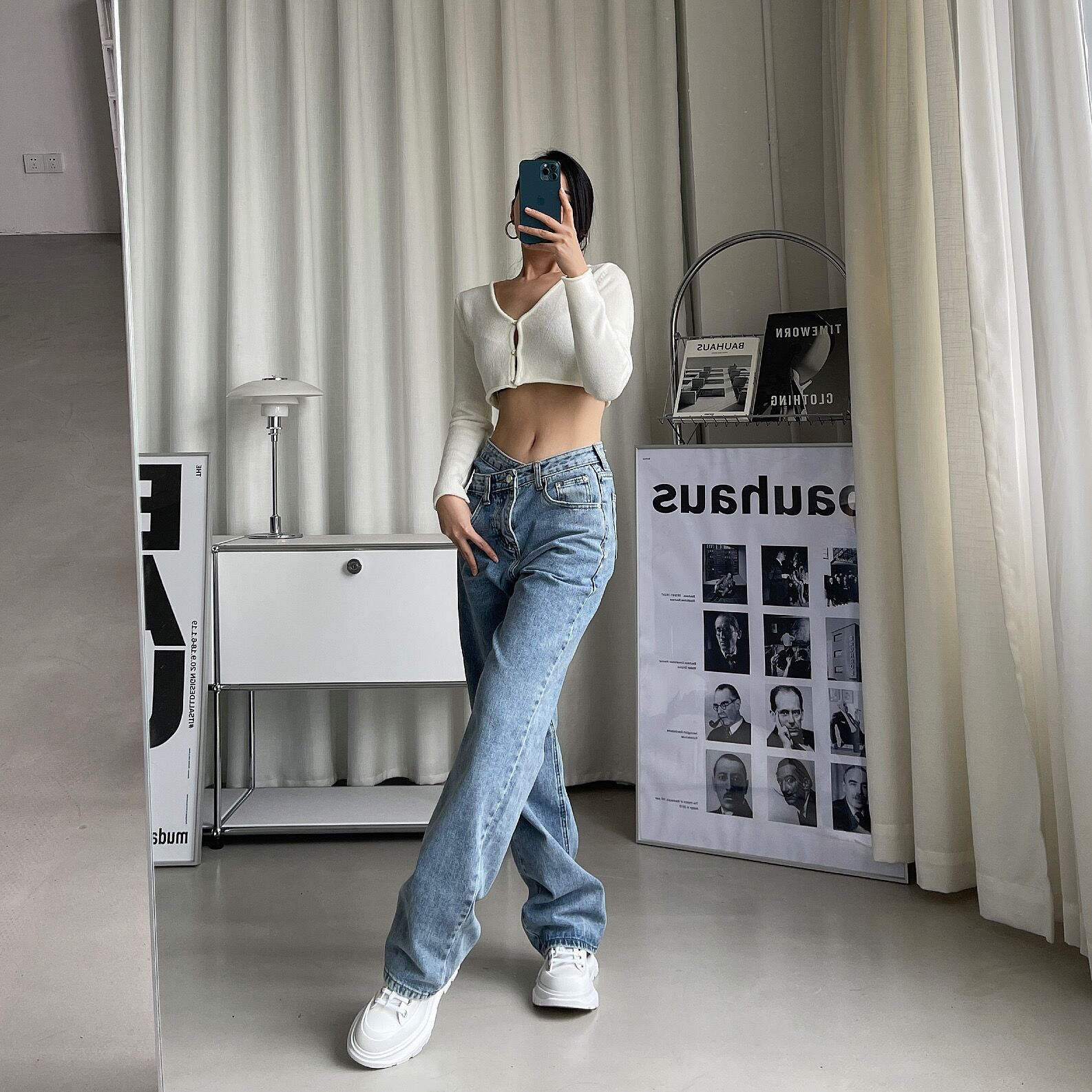 Spring new high waist straight waist loose waist design feeling street jean women pants